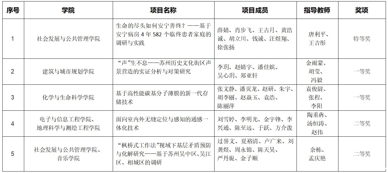 6月7日-9日,第十九届“挑战杯”全国大学生课外学术科技作品竞赛江苏省选拔赛决赛在南京信息工程大学落下帷幕。我校获特等奖1项、一等奖2项、二等奖2项,并连续3年获省赛优胜杯。社会发展与公共管理学院《生命的尽头如何安宁善终?——基于安宁病房4年582个临终患者家庭的调研与实践》、建筑与城市规划学院《“声”生不息——苏州历史文化街区声景营造的实证分析与对策研究》两个项目成功跻身国赛。