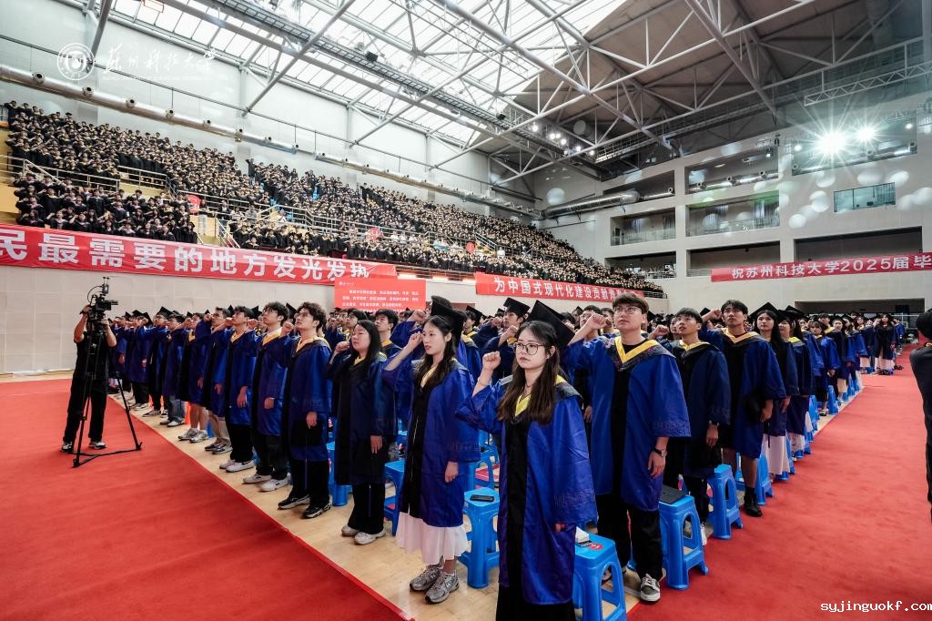 毕业生代表、环境科学与工程学院土木水利专业2022级研究生张晓秾同学带领全体毕业生宣誓,表示将用激情和才华肩负起中华民族伟大复兴和人类进步的使命,用青春和热血续写苏科大新的辉煌。