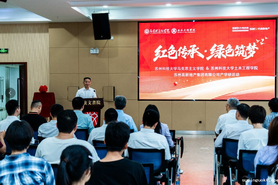 6月11日,我校马克思主义学院、土木工程学院与苏州高新地产集团在敬文书院报告厅举办“红色传承・绿色筑梦”产学研活动。苏高新地产集团党总支书记、董事长张晓峰,党总支副书记、总经理丁旺,我校党委常委、副校长温波,土木工程学院党委书记赵宝成,马克思主义学院党委书记隋爱红,学报编辑部主任陈鑫等出席活动,苏州高新地产集团职工代表、我校师生代表参加活动。